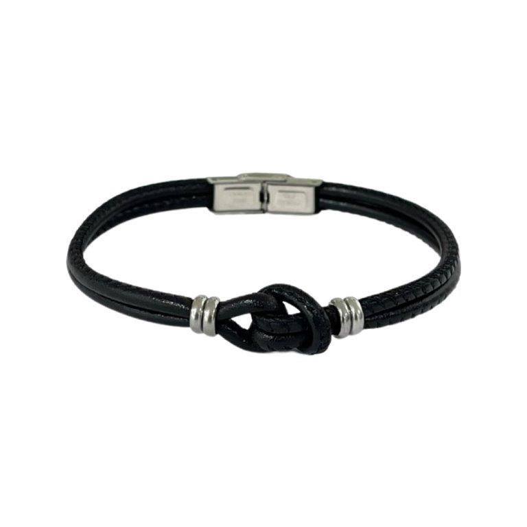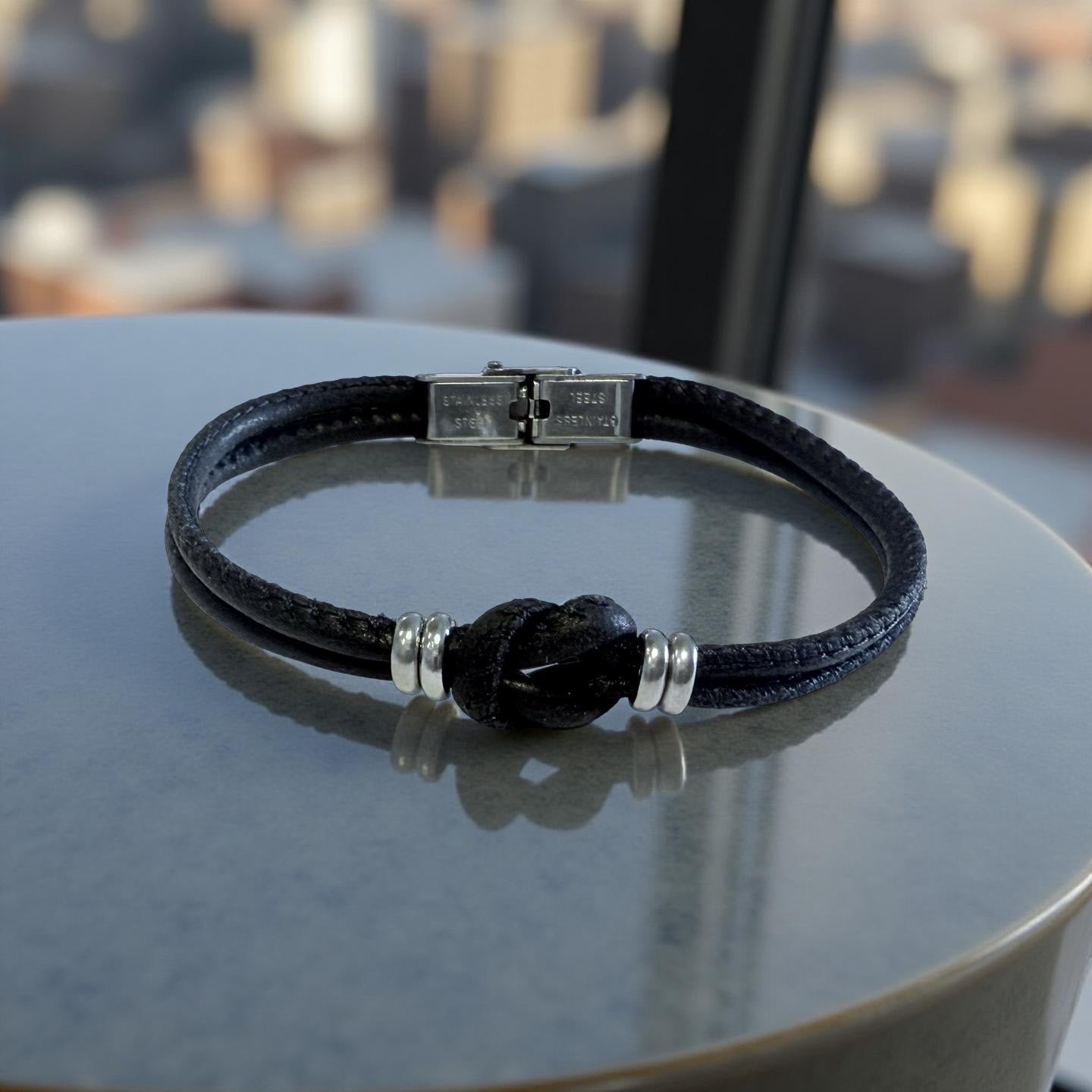 Tyylikkään musta nahkarannekoru, jonka keskellä oleva solmu toimii katseenvangitsijana – ja kantaa mukanaan symbolista merkitystä. Solmu voi edustaa yhteyttä, sitoutumista, pysyvyyttä tai elämän solmukohtia, joista selviää – jokainen voi tulkita sen omalla tavallaan.