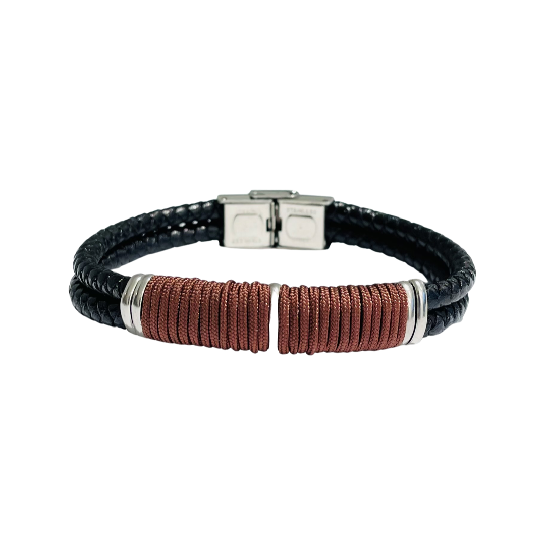 Musta nahkarannekoru ruskean värisellä puuvilla naru koristeella.