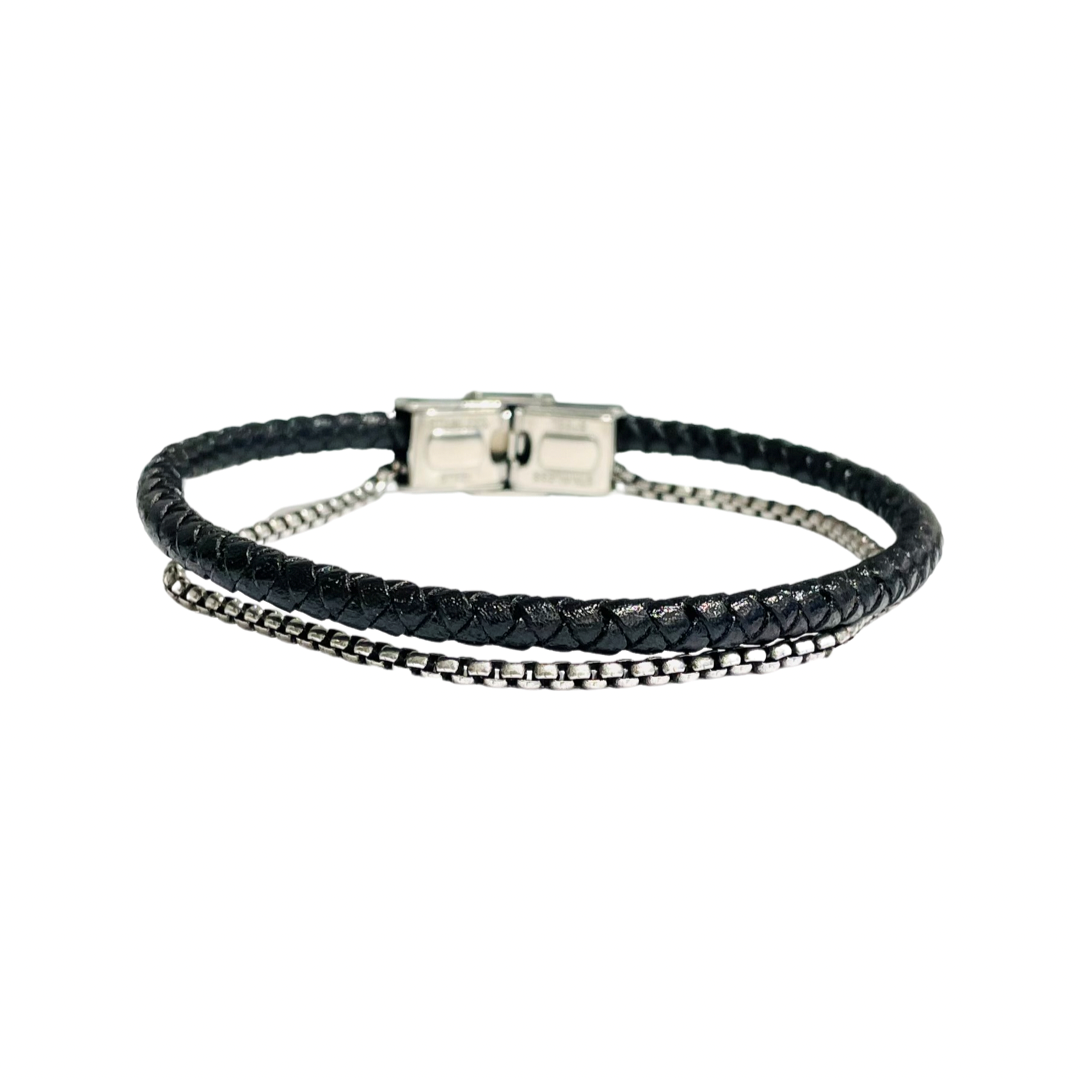 Kaksiosainen rannekoru - teräs ja nahkaranneke yhdessä.