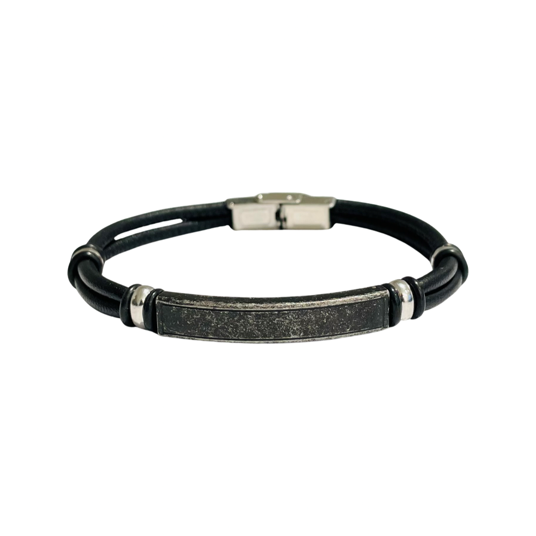 Musta nahkaranneke 7,2 mm:n levyisellä ja 4,2 cm:n pituisella tummalla teräslaatalla. Koko muutettavissa lyhyemmäksi. Valmistusmaa Italia, DFJ Design.