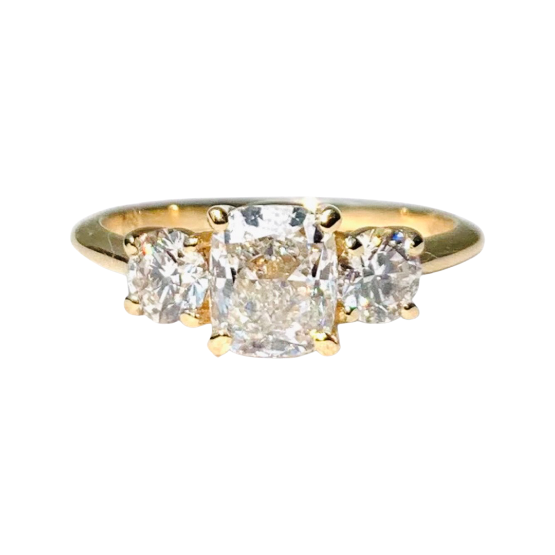 Näyttävä timanttisormus, jonka keskelle istutettu 1.23 ct Cushion-cut timantti ja sen molemmin puolin Brilliant-cut timantit, yhteispainoltaan 0.64 ct. Timanttien laatu G/VS. 18 kt kultaa.