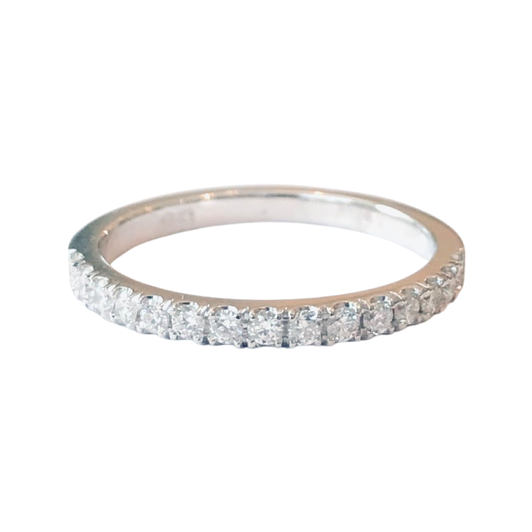 18 kt valkokultainen rivisormus. Timantit kauttaaltaan sormuksen ympäri. Timanttien yht. paino 0.84 ct. Timanttien laatu G/VS. Sormuksen leveys 2 mm.