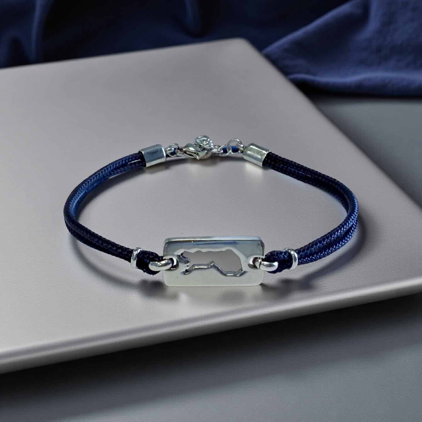 Tyylikäs, kestävä marine-värinen tekstiilinyöri-rannekoru, jossa on näyttävä, 2 mm paksu teräslaatta (18 x 10 mm). Laattaan on kaiverrettu Suomen kartta läpi koko laatan, tuoden koruun syvällisen ja isänmaallisen sävyn.