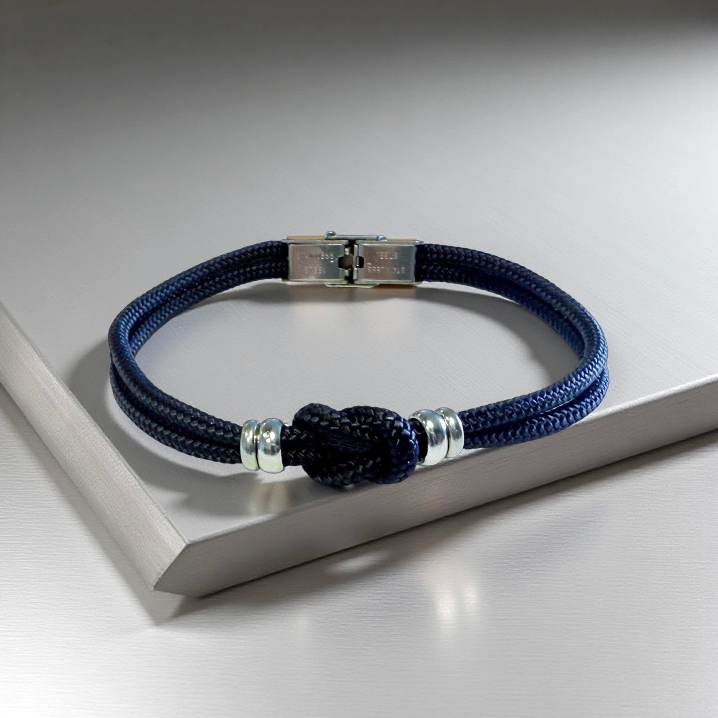 Tyylikäs laivastosininen rannekoru, jonka keskellä oleva solmu toimii katseenvangitsijana – ja kantaa mukanaan symbolista merkitystä. Solmu voi edustaa yhteyttä, sitoutumista, pysyvyyttä tai elämän solmukohtia, joista selviää – jokainen voi tulkita sen omalla tavallaan.