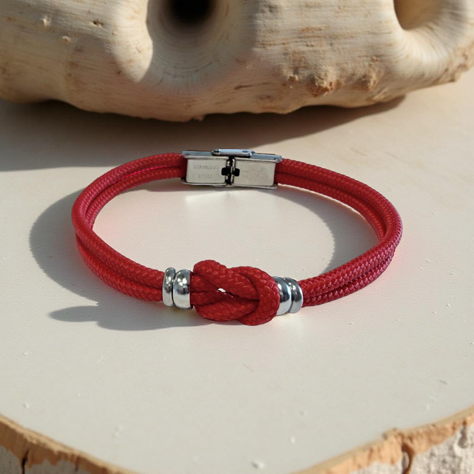 Tyylikäs punainen rannekoru, jonka keskellä oleva solmu toimii katseenvangitsijana – ja kantaa mukanaan symbolista merkitystä. Solmu voi edustaa yhteyttä, sitoutumista, pysyvyyttä tai elämän solmukohtia, joista selviää – jokainen voi tulkita sen omalla tavallaan.